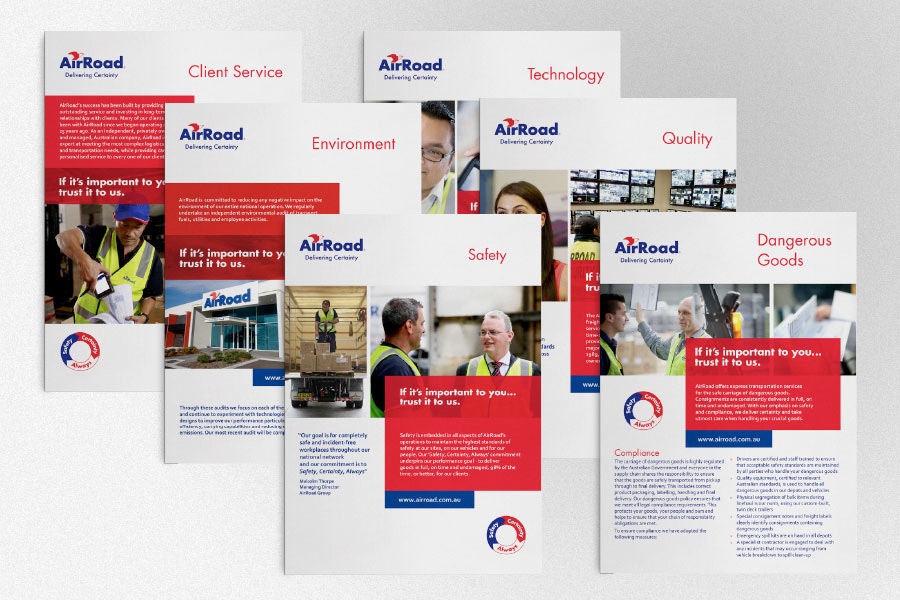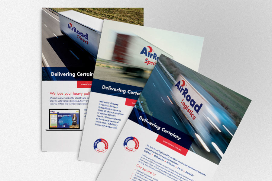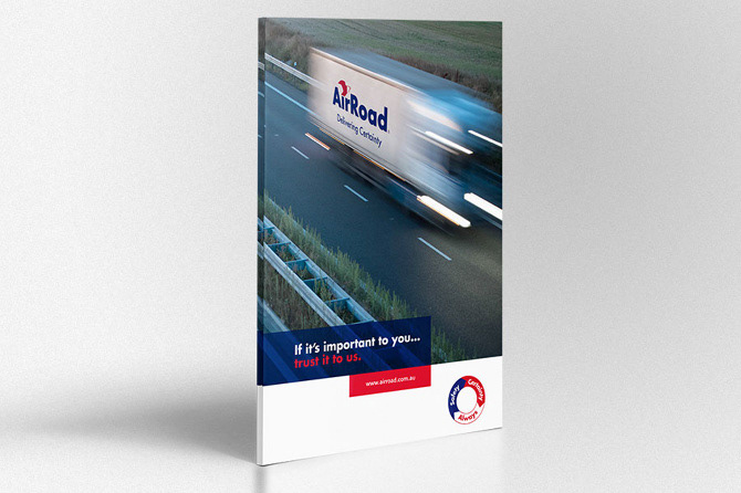 A corporate study and promotional layout for AirRoad, an Australian-based transportation company. The objective was to apply the company's theme of expediency and color scheme to a set of print and digital materials. (Logo design is not mine)